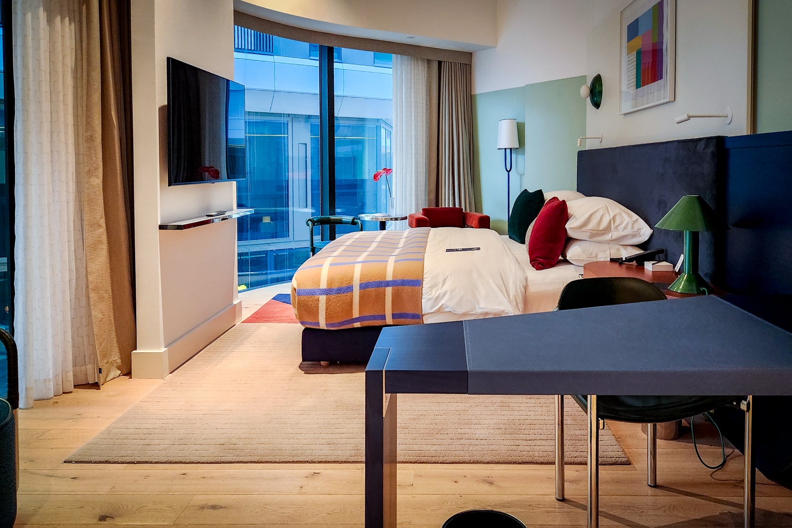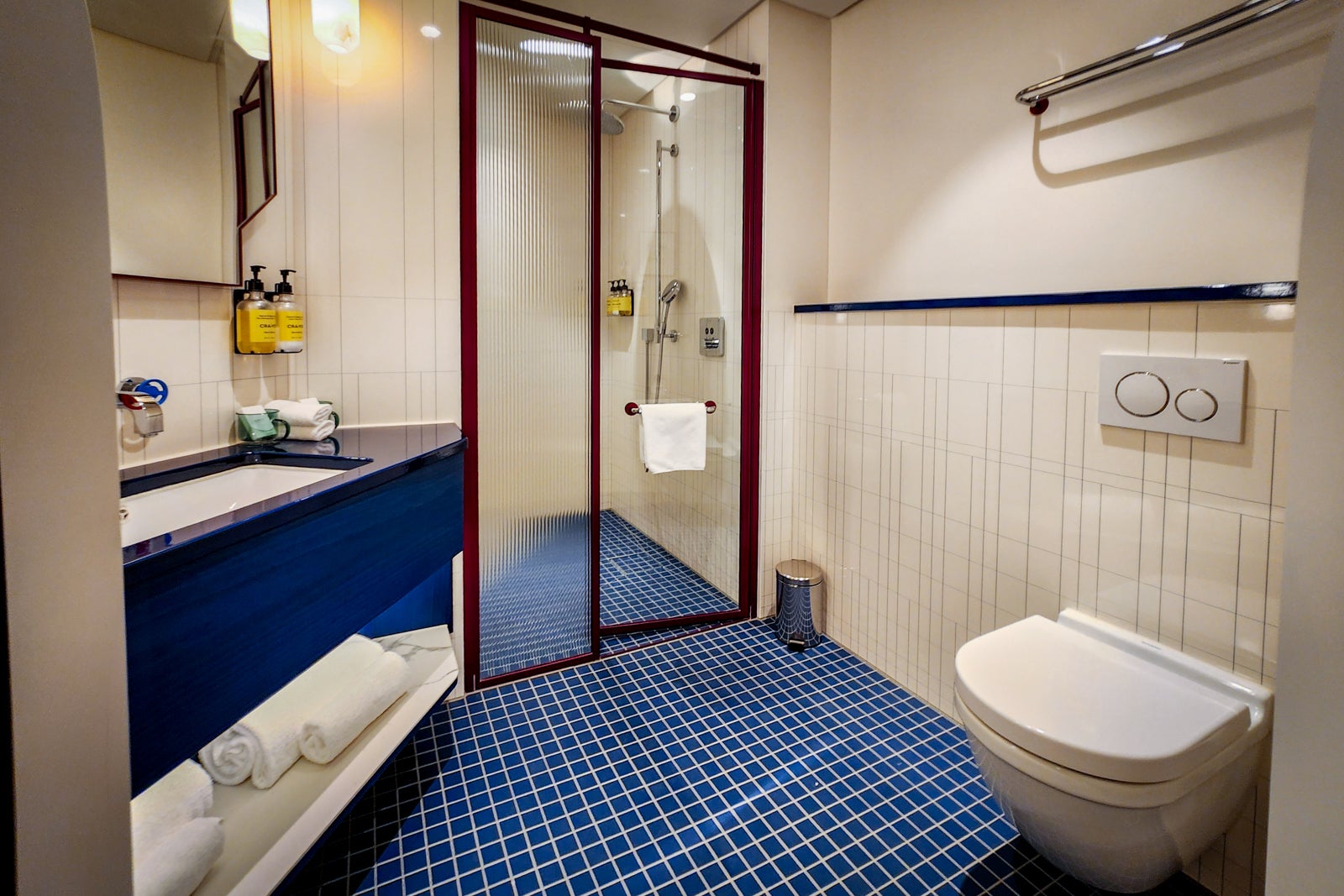 The only shortcomings were a few awkwardly designed elements in the bathroom (but the design here was especially fun, with pops of color and a beautiful navy blue tiled floor). Despite the space’s relatively roomy dimensions, the countertop space was limited and the shower felt cramped, making it tricky to access the soap dispensers. There was also nowhere to hang a hand towel near the sink, and the circular knobs proved difficult to turn with wet hands.