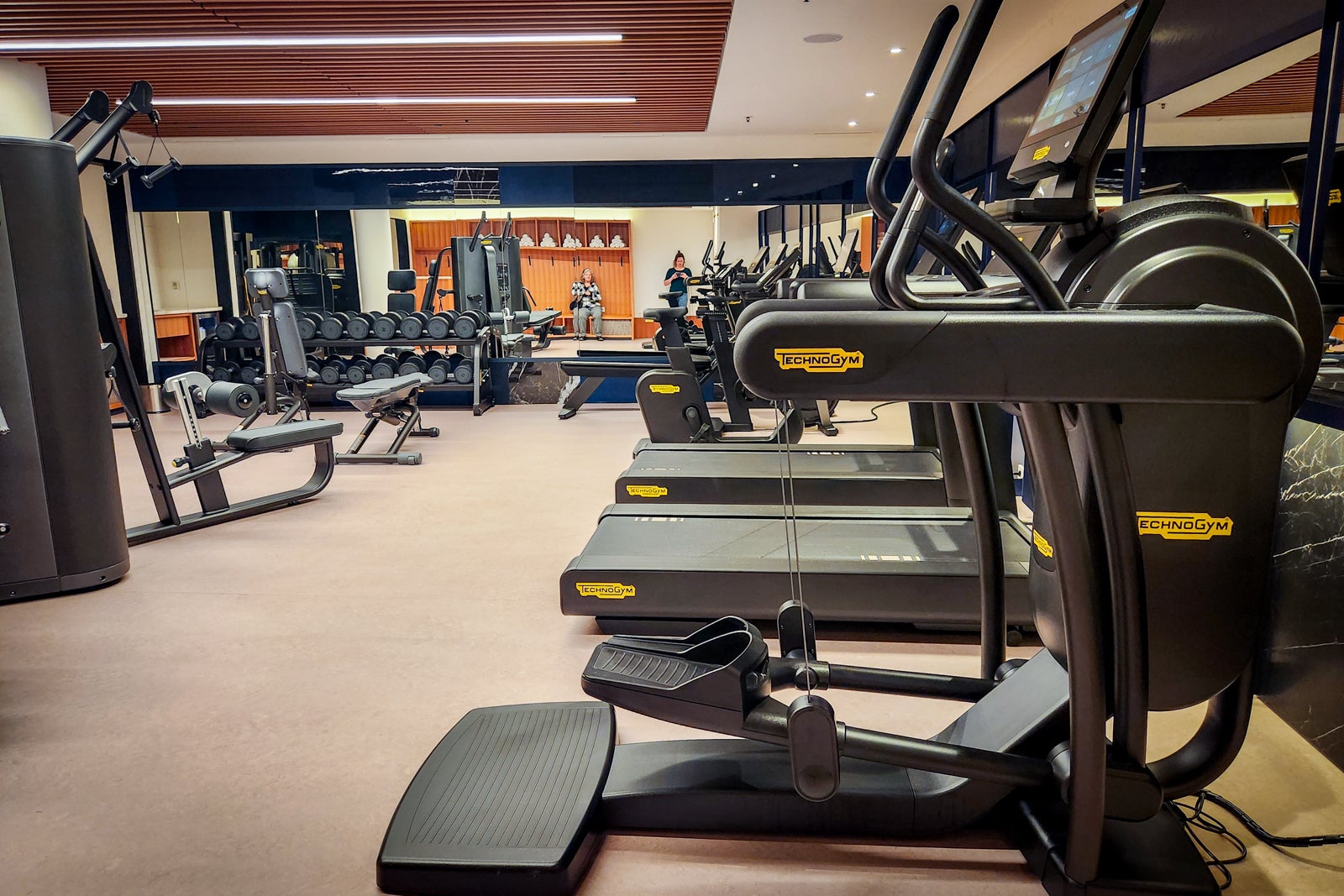 - A fitness center with cardio machines, weight machines and free weights.