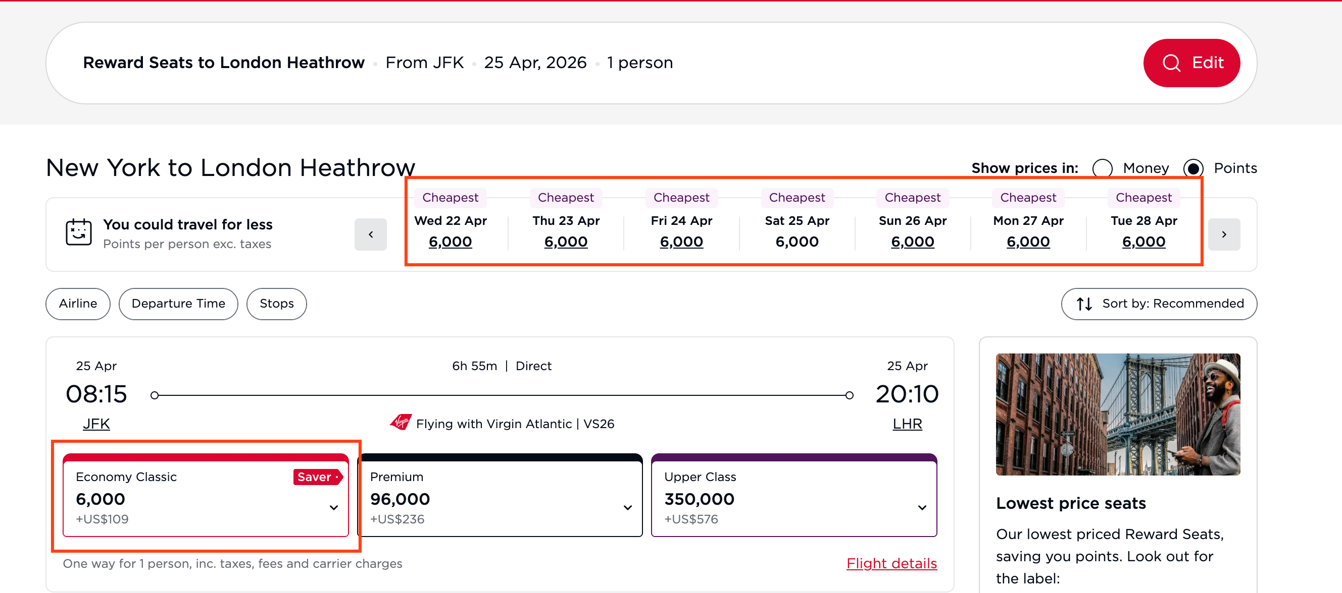 Fly to London in economy from 6,000 Virgin Red points or in business class from 29,000 points